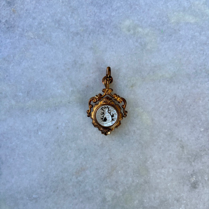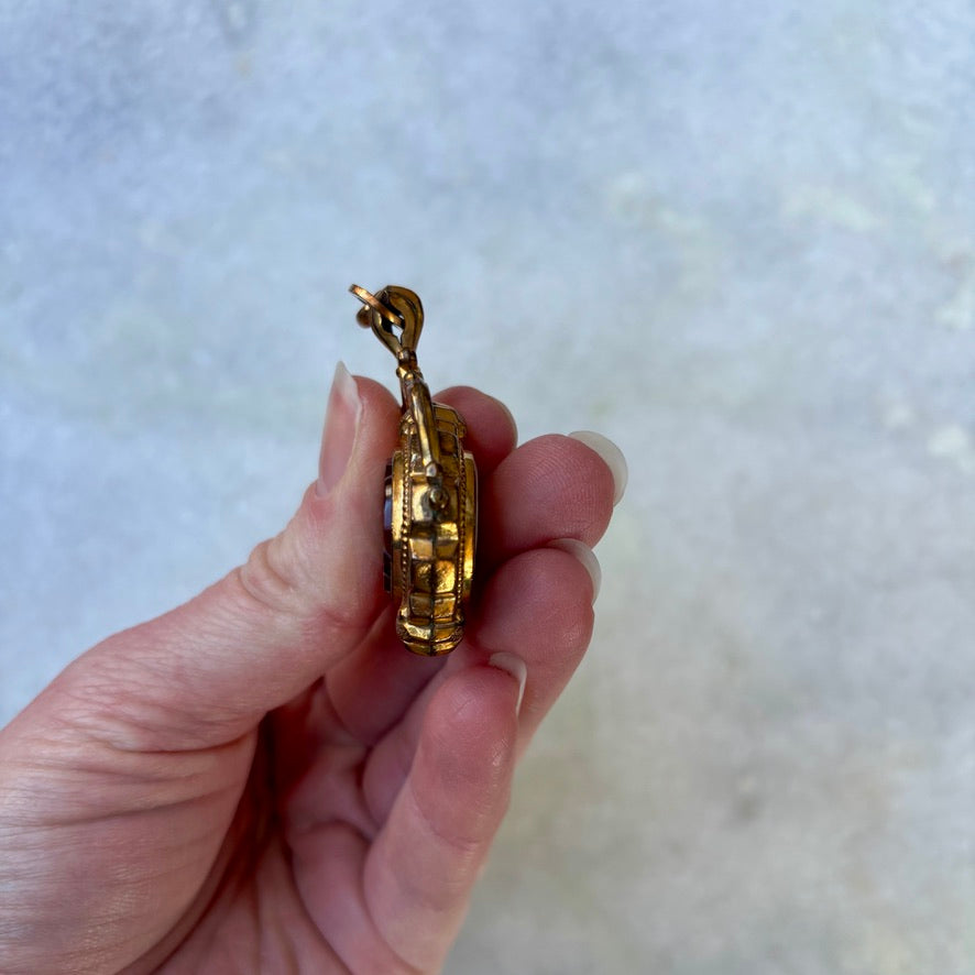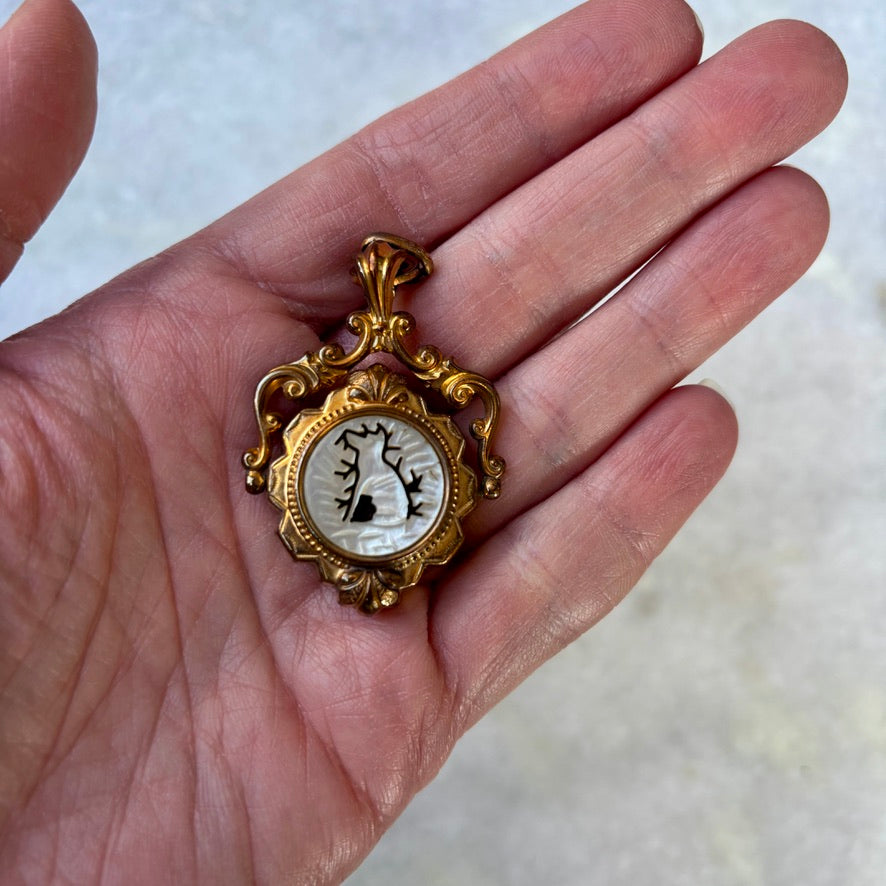 Antique Ornate Double Sided Mother of Pearl Wolf Spinner Banded Agate Fob Pendant