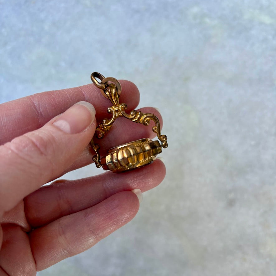This fob is a nice, heavier weight and has a good spin to it. It doesn't have any markings but I believe it is rolled gold or gold plated.