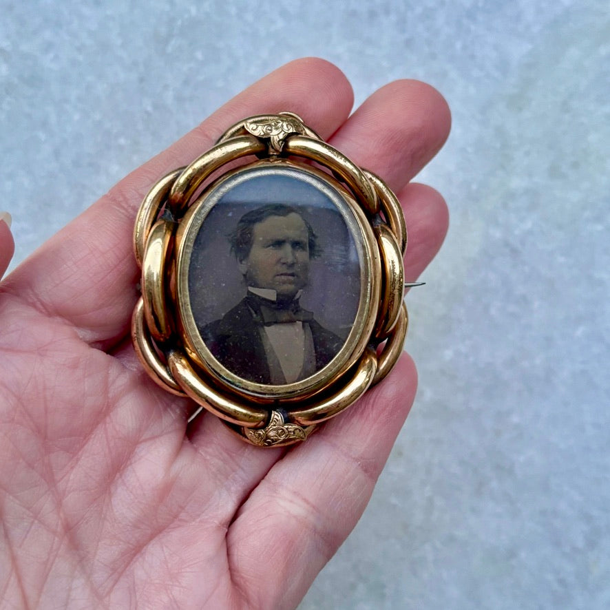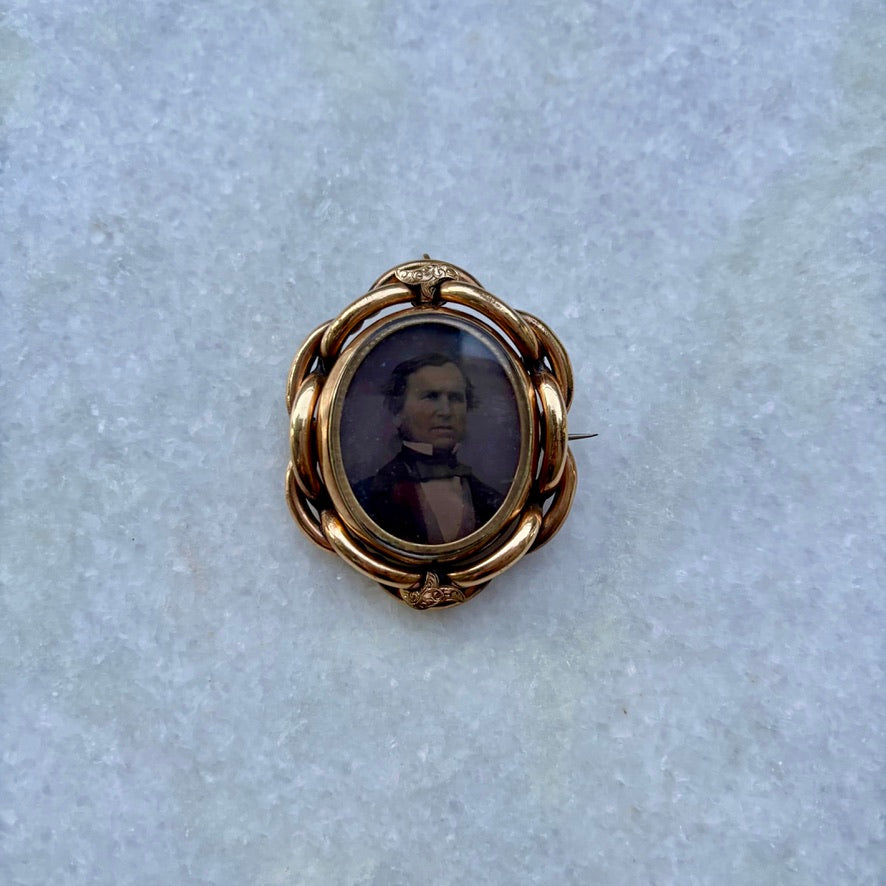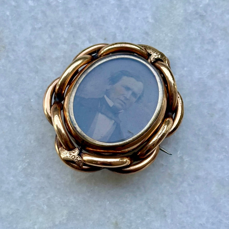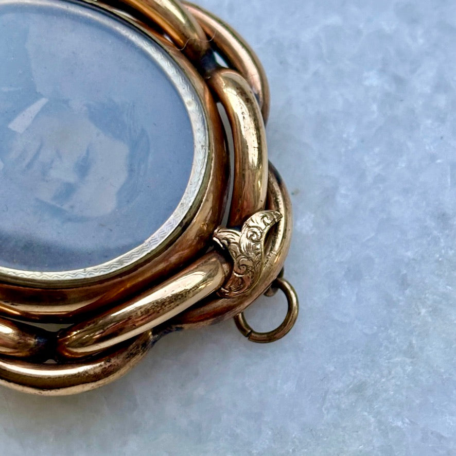 Chain like frame with swivel centre- on one side there is a photograph and on the other side it is blank. Traditionally the other side would have had a lock of hair of the person who had passed away.