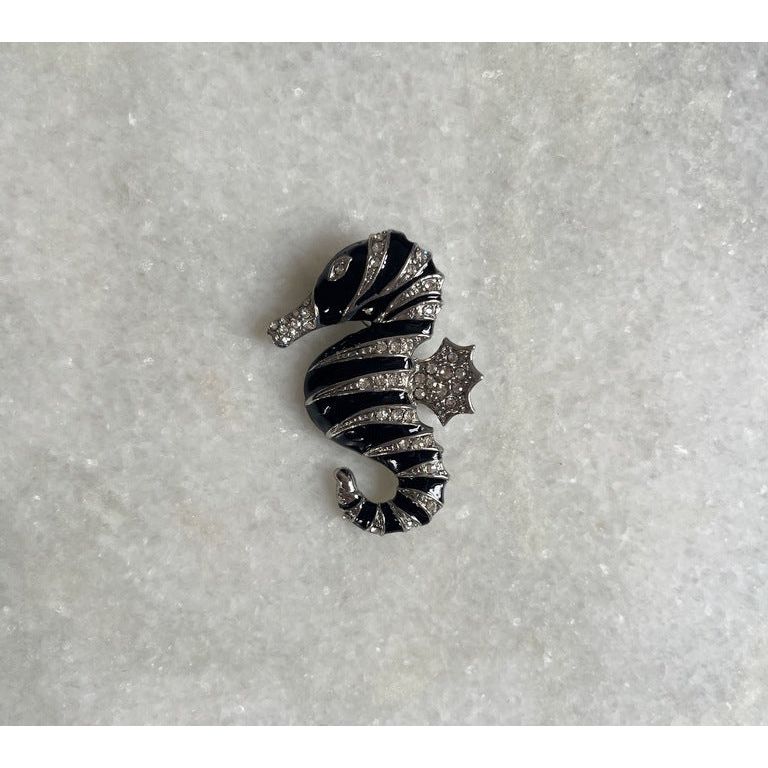 A sweet seahorse brooch made up of a silver base metal with black enamel and rhinestone details.