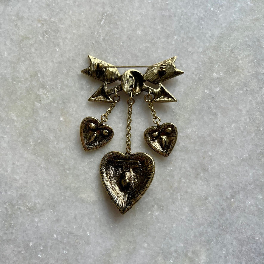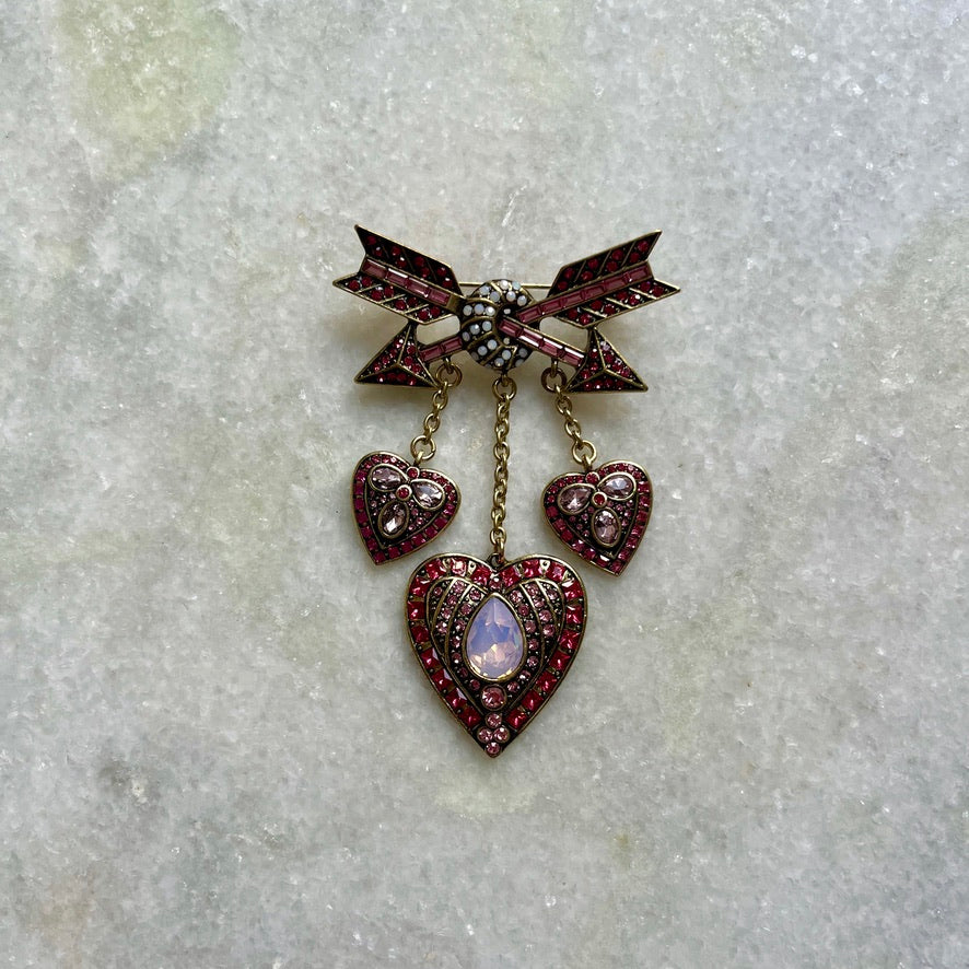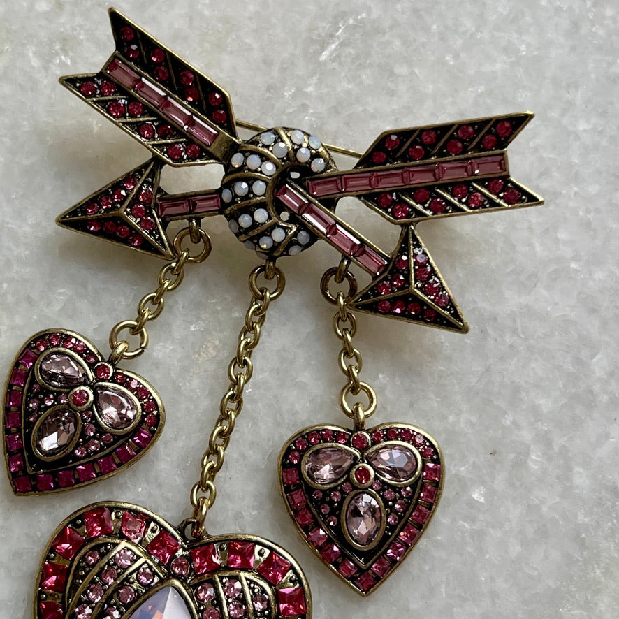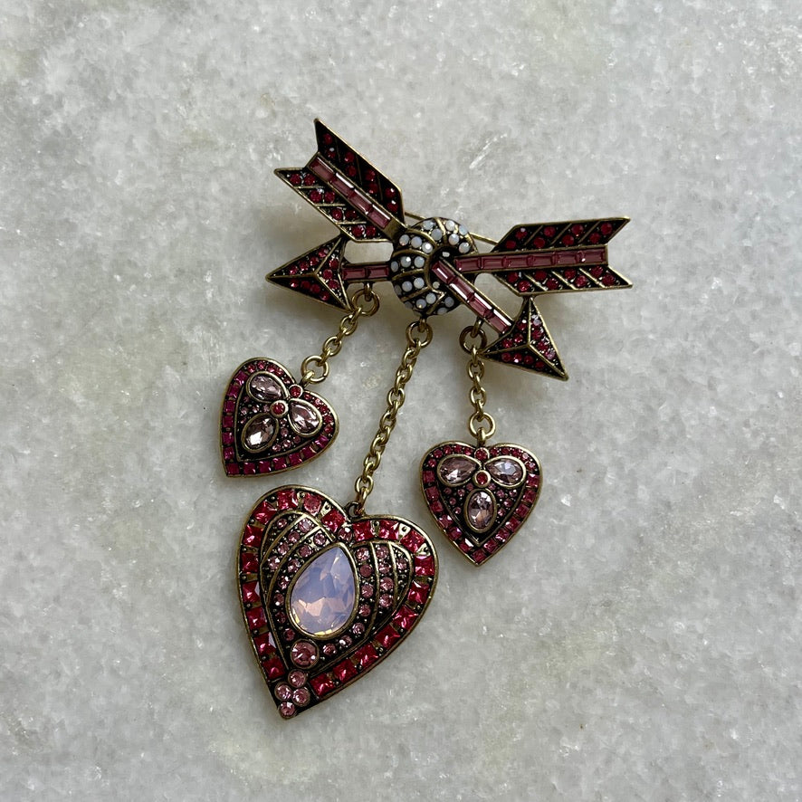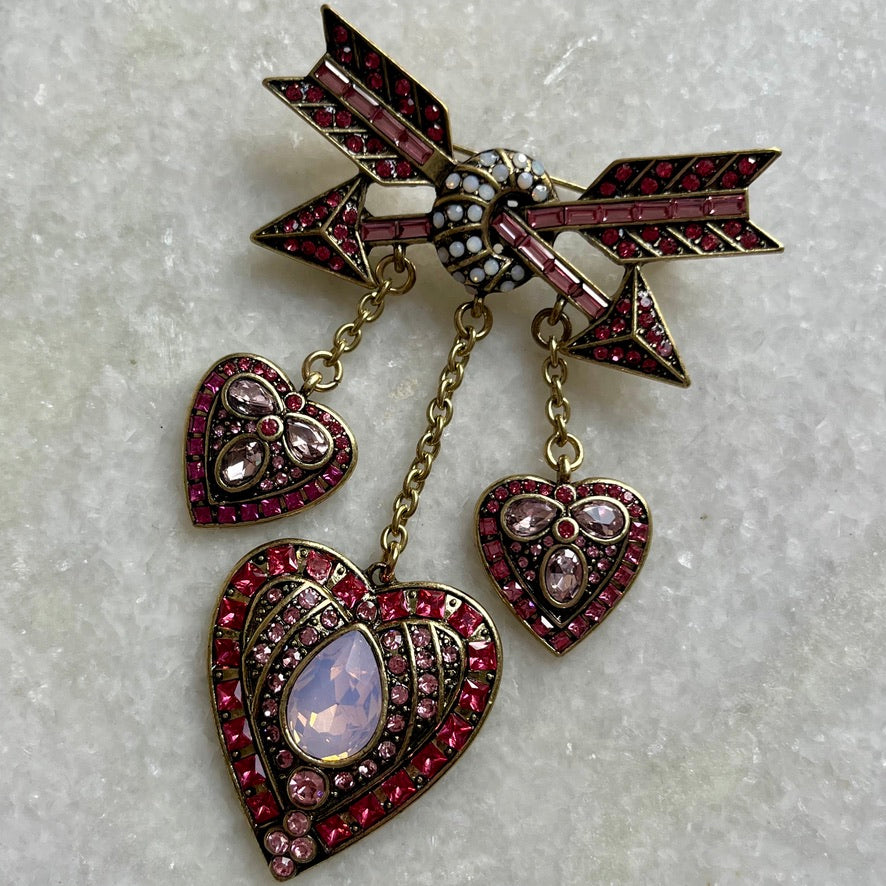 This beautiful brooch is called 'Lots of Love' and features 3 dangly hearts from 2 of cupid's arrows.