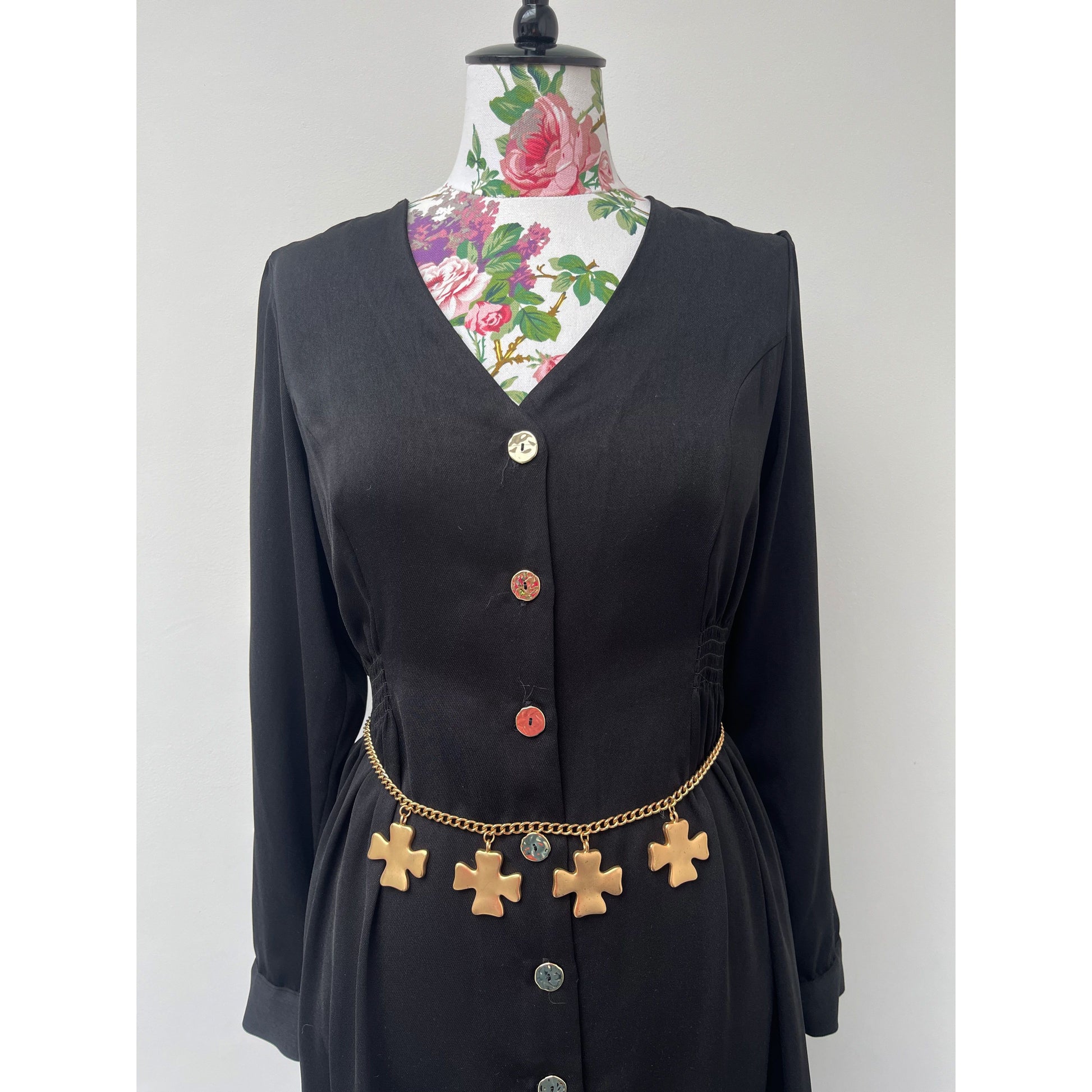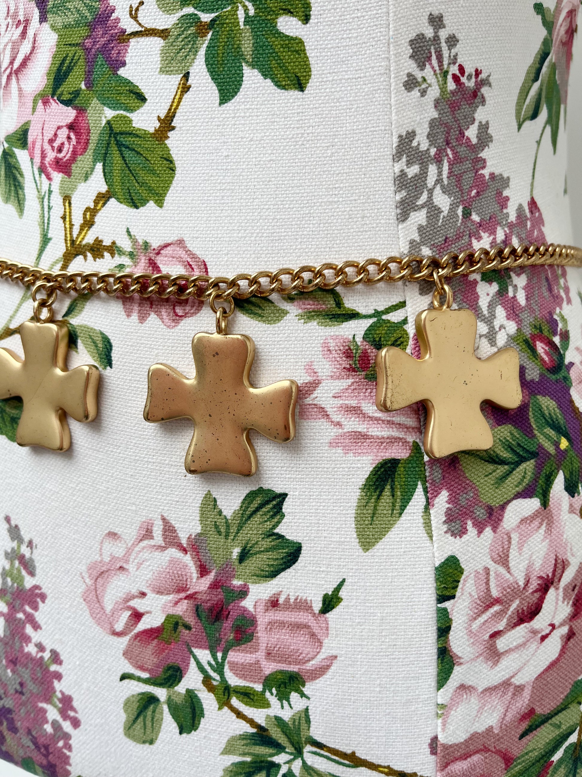 A timeless classic from Kenneth Jay Lane. This gold tone chain belt has 4 cross charms on it. Each charm has the Kenneth Lane stamp on the back.