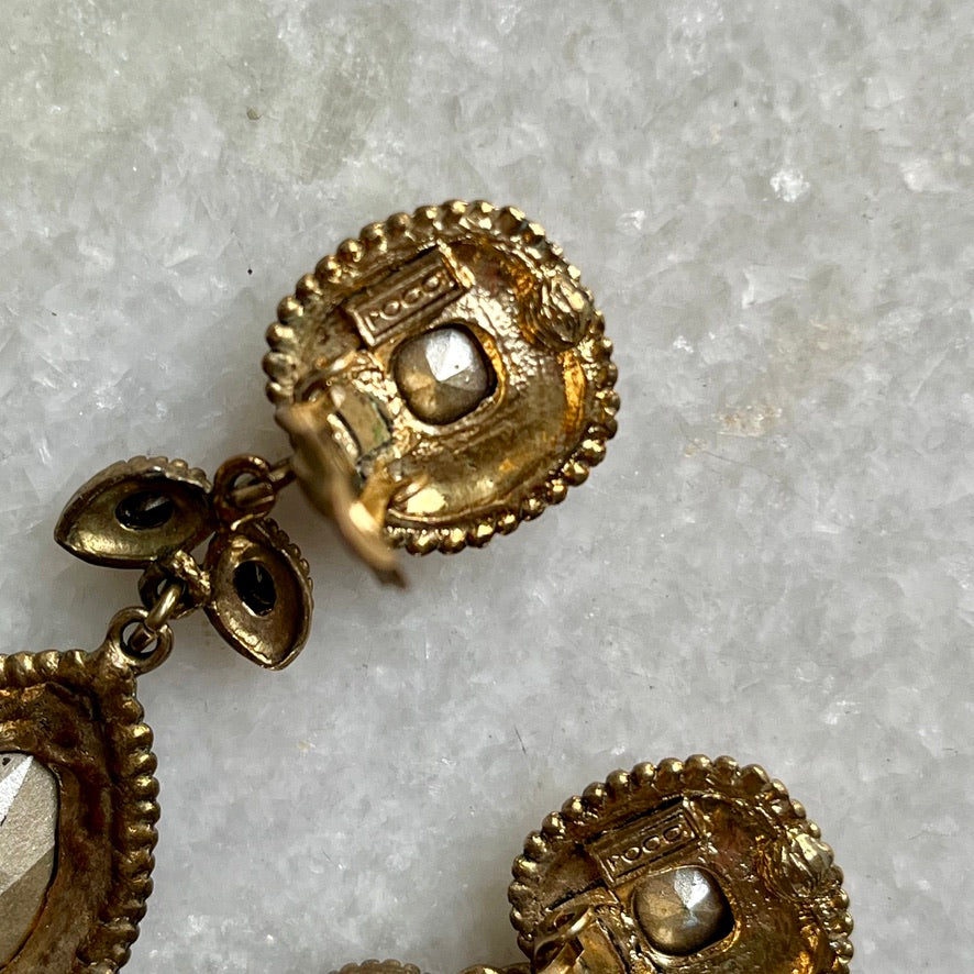 The earrings are in good condition and show some signs of wear. This is mostly on the back where you can see in the photos there are scratches to the back if the large stones. There is also the odd small chip here and there on the large stones.