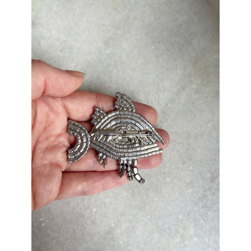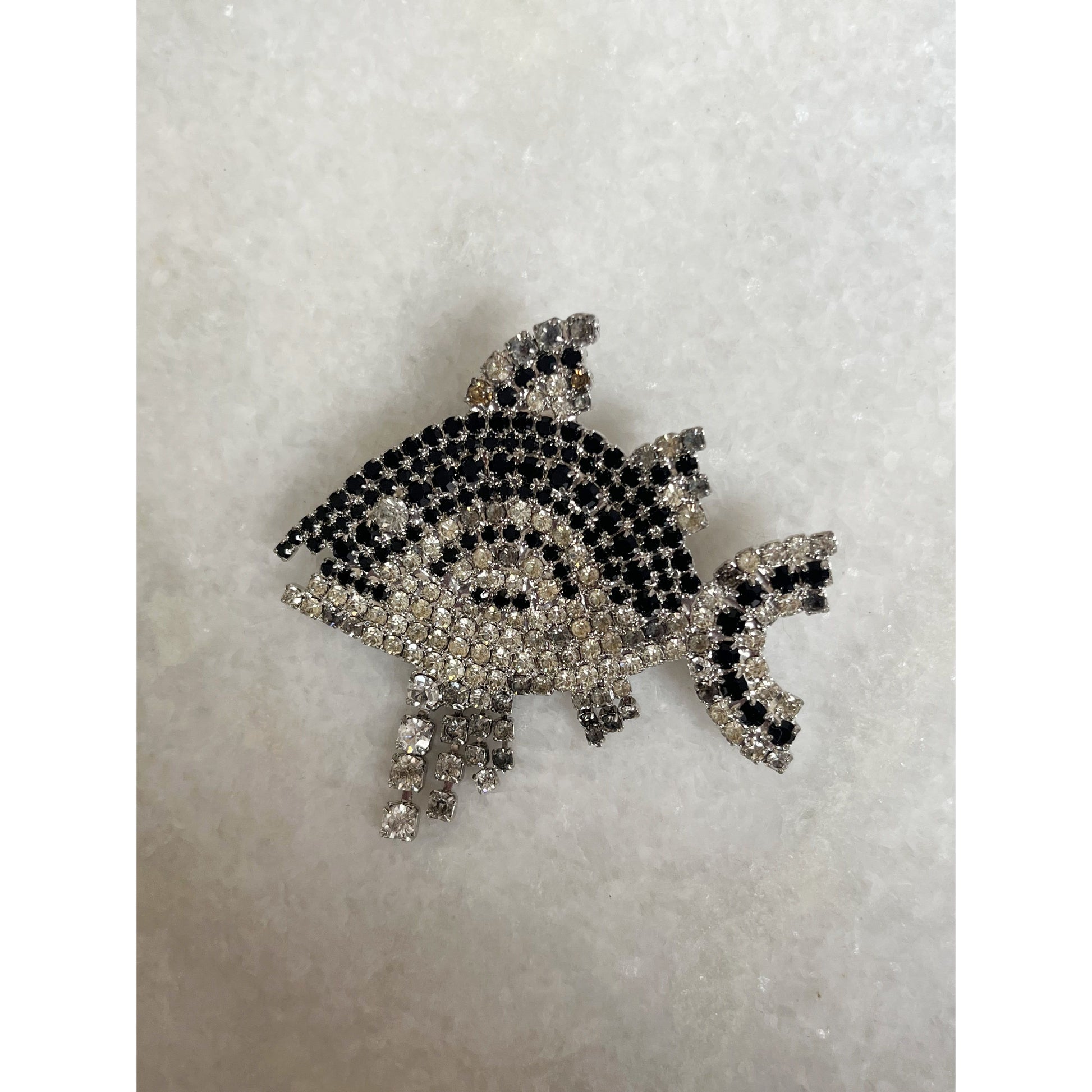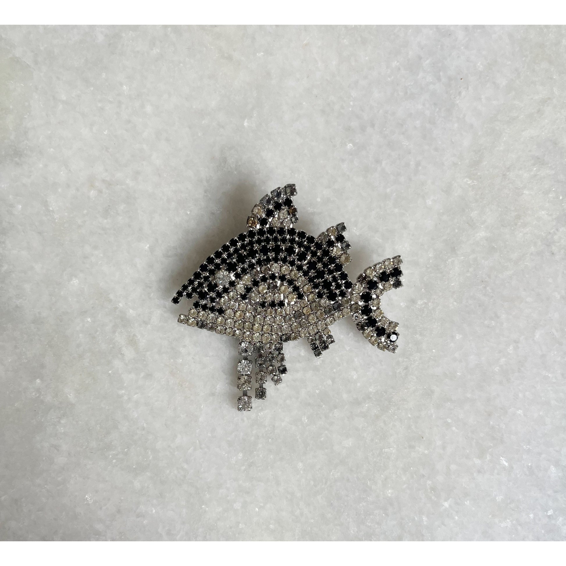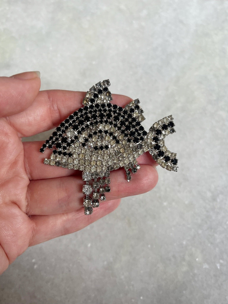 This funky fish is made up of black, grey and clear rhinestones. His fin at the bottom moves in a tassel like way which adds movement when wearing the brooch.
