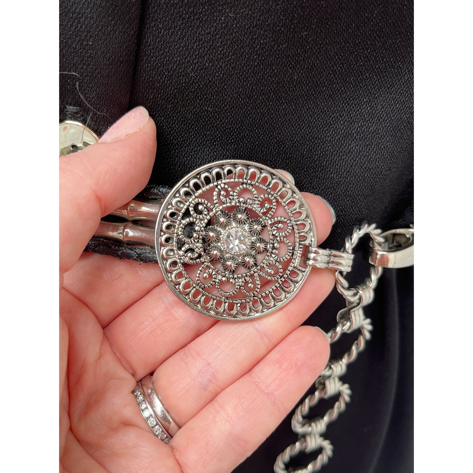 Silver Tone Bamboo and Rhinestone Disc Faux Leather Belt.