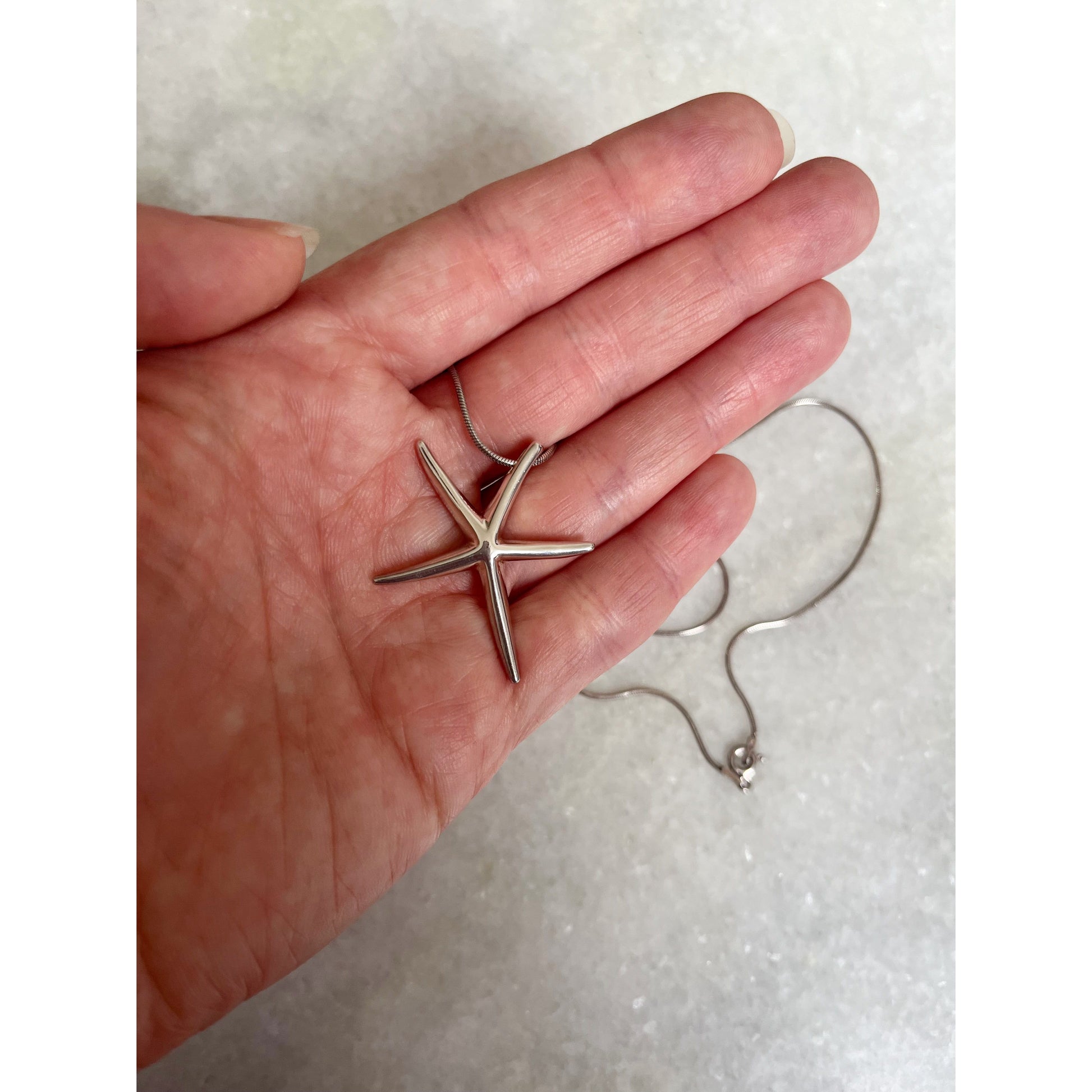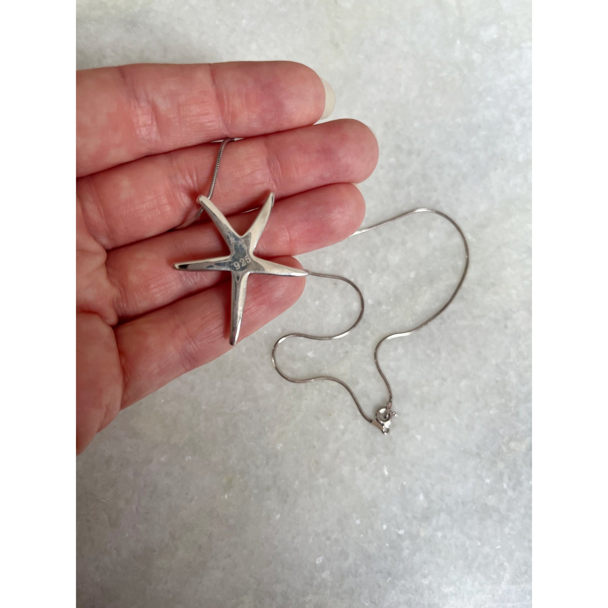 This necklace is a classic piece that is perfect for summer. The chain is 925 silver and is stamped on the clasp. The starfish pendant is stamped 925 on the back.