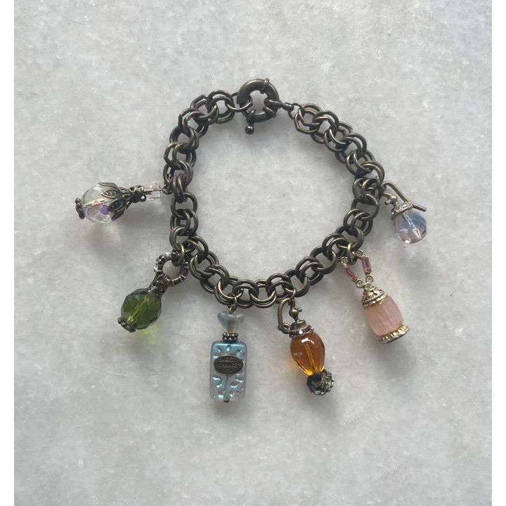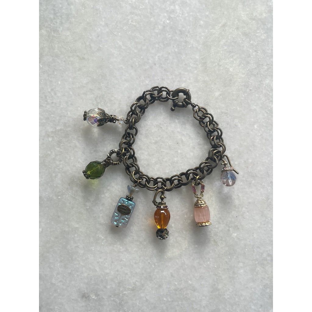 This super cute bracelet features 6 perfume bottle charms in different shapes. One has a little plaque on it saying 'Sweet Romance USA'. The chain is a very dark bronze colour to give the antique look to the piece.