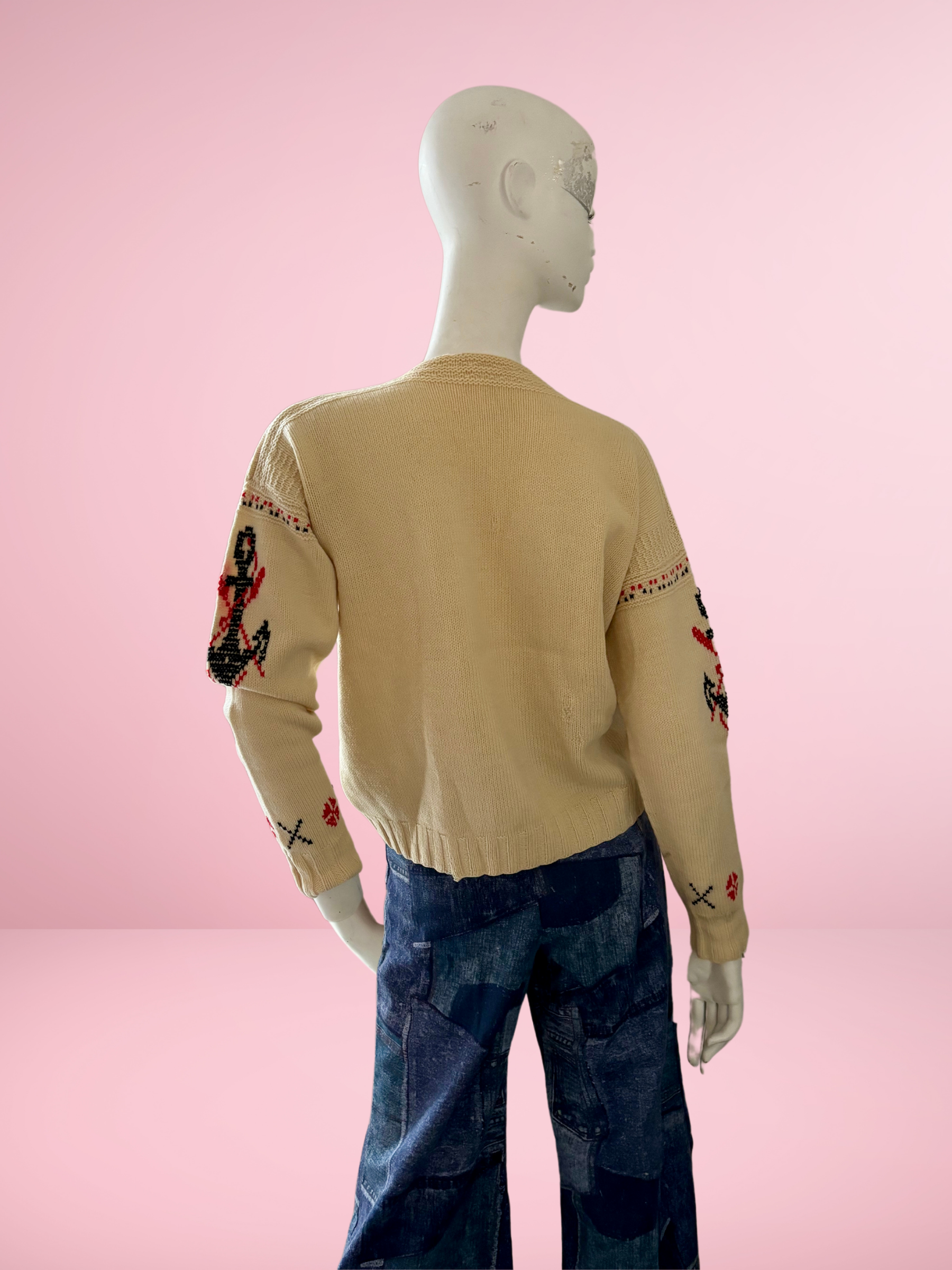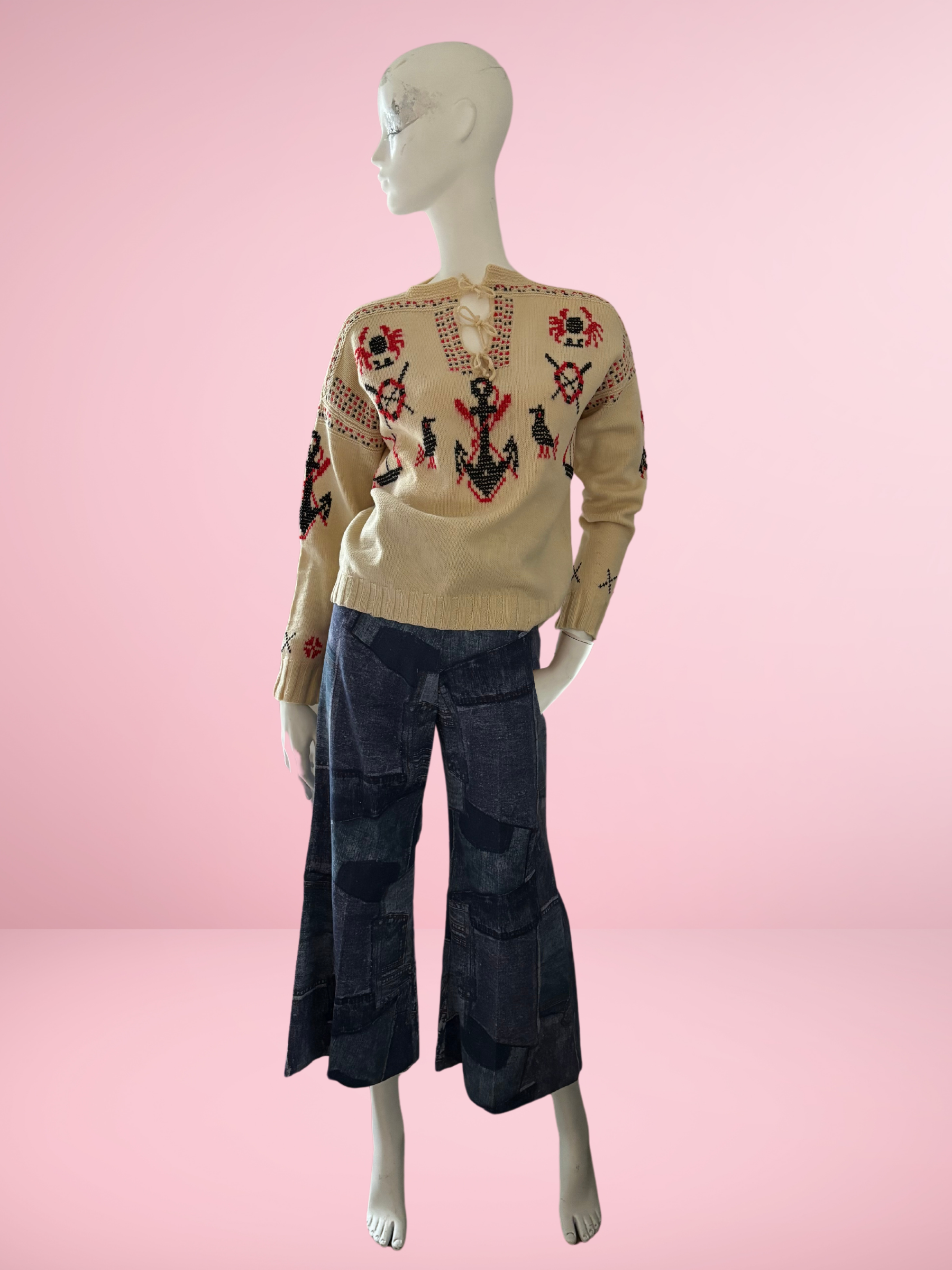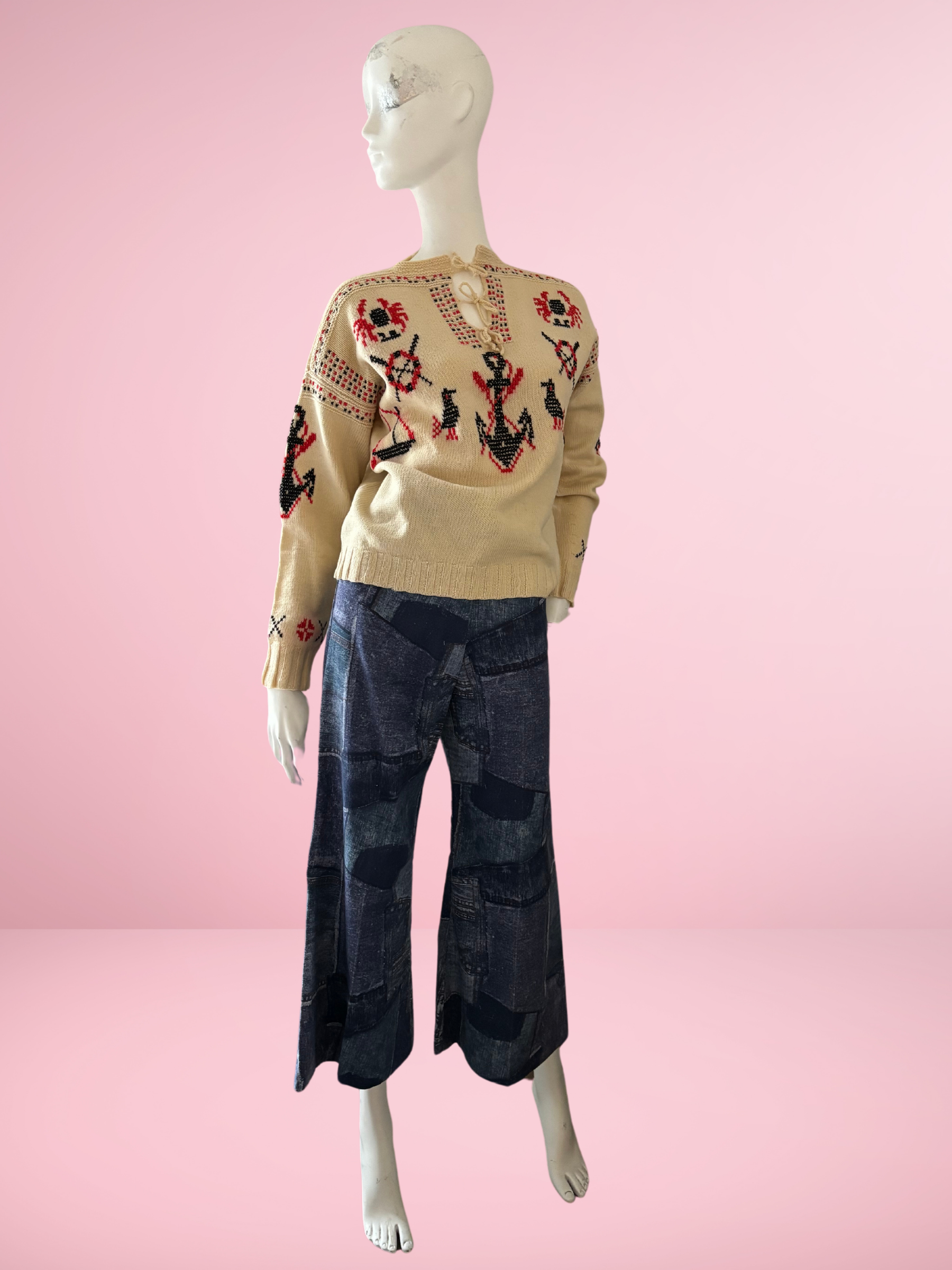 - The red dye has bled in to the cream throughout the jumper- mostly around the icons that have the red thread but there may be small areas elsewhere.