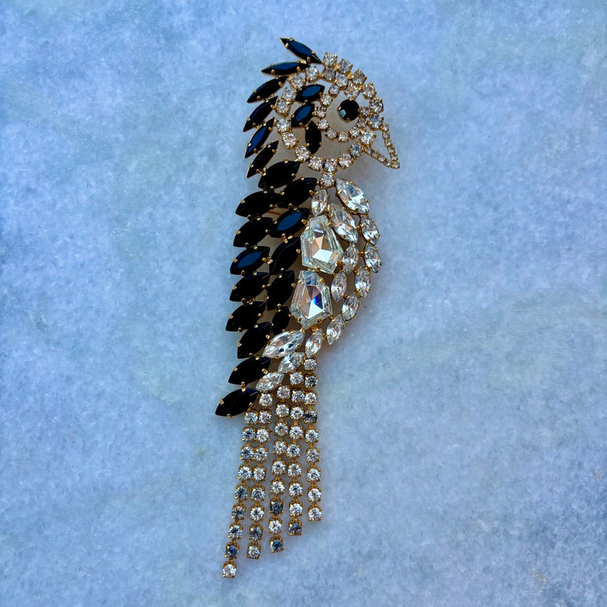 Black and silver rhinestone bird brooch with tassel style tail feathers.